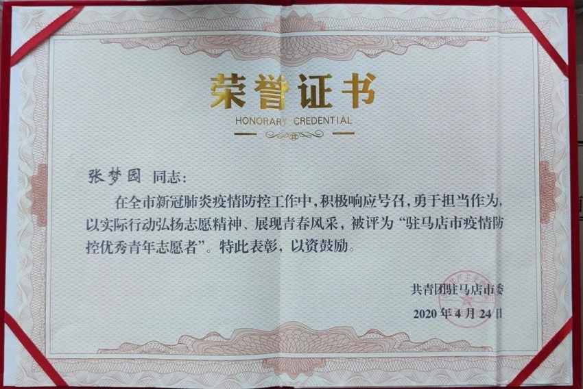 平正公司團工委榮獲“駐馬店市五四紅旗團委”稱號,辦公室(黨群辦公室)綜合干事張夢園榮獲“駐馬店市疫情防控優秀青年志愿者”稱號。