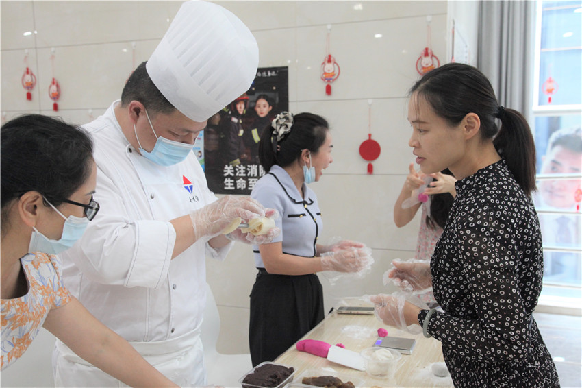 參加活動(dòng)人員在專業(yè)烘焙老師的講解示范下,相互探討打月餅皮、揉餡、包月餅等環(huán)節(jié),積極動(dòng)手揉面、搟皮、包餡、整形,充分體驗(yàn)到了制作月餅的快樂過程,呈現(xiàn)出了溫馨、和諧、團(tuán)圓的喜慶氛圍。