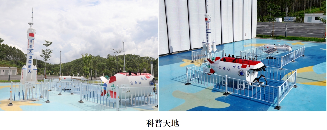 科普天地是一個充滿科技感和未來感的室外空間,該區域主要有長征運載火箭、蛟龍號載人潛水器、天和核心艙3個模型,模型由鋼軌扣件、儲風罐、風缸、過濾閥、機車攝像頭、角鐵等制作而成,向游客普及載人航天、載人深海潛水知識,展示中國這條巨龍“可上九天攬月,可下五洋捉鱉”的強大科技力量。