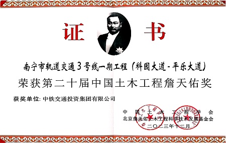10月22日,第二十屆中國土木工程詹天佑獎頒獎大會在江蘇省蘇州市舉行。大會對中國土木工程詹天佑獎獲獎工程進行了表彰,由中國中鐵總承包、中鐵交通建設管理的南寧市軌道交通3號線一期工程(科園大道一平樂大道)榮膺上榜,這是該工程繼被評為中國建設工程魯班獎后,榮獲的又一國家級獎項。